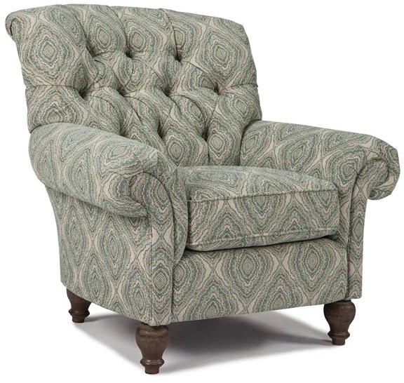 The traditional Christabel club chair is perfect for the study or a handsome den. The arms slightly flare outward, offering smooth lines for nothing but comfort as you sit back into the plush button-tufted back. The precisely carved feet come in an Antique Black, Distressed Pecan, or Riverloom finish to complement whatever fabric covering your choose. It is this type of attention to detail that sets Best apart from the rest. Matching ottoman available.