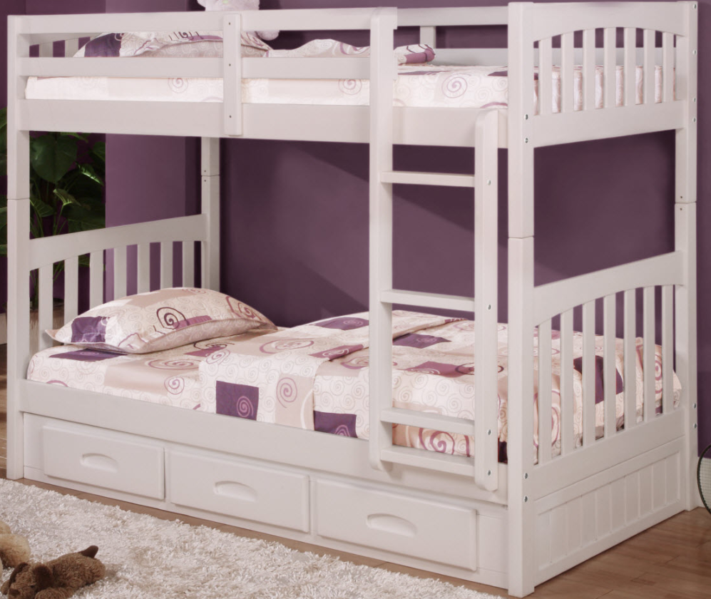 Our White Twin over Twin Bunk Bed is constructed from solid pine with some minor MDF. However, everything structural on the bed such as rails and uprights are solid wood. This bed included a complete webbed slat kit so you do not have to worry about a box spring or bunkie boards! With the option of adding a fully assembled 3 drawer storage unit under the bed or a twin size trundle, this bed has the option for whatever you may need.