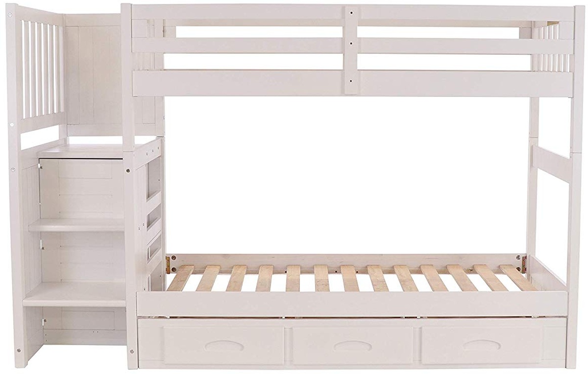 Our Stair Stepper bunk bed not only provides a safer alternative to a traditional bunk bed ladder but also includes a built in four drawer chest. Our unique design allows the staircase to go on either side of the bed, allowing the customer to set up the bed whichever way works best for them.Read More