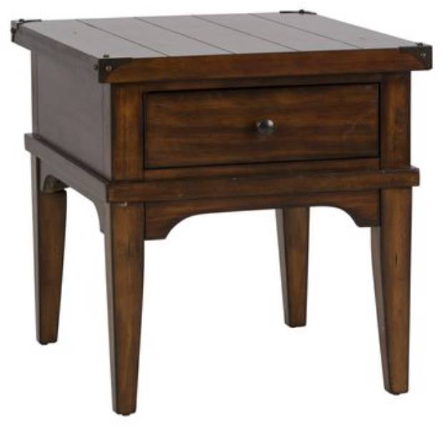 Elevate your space with the traditional Aspen Skies end table. Crafted of pine solids and New Zealand pine veneers with metal accents, this piece features a russet brown finish, appealing planked top with metal accents and nail heads in each corner, one fully stained full extension drawer for additional storage, pewter knob hardware, anchored by a tapered leg design. A great addition to any rustic style space.Read More
