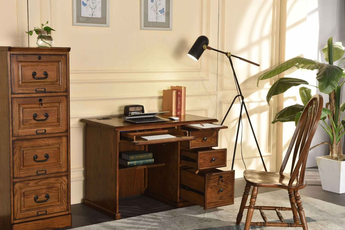 The TEI burnished walnut 42" flat top desk offers durability and timeless appeal. Expertly crafted for everyday use, it provides a spacious work surface and ample organization, making it an ideal addition to any home office or study area.Read More
